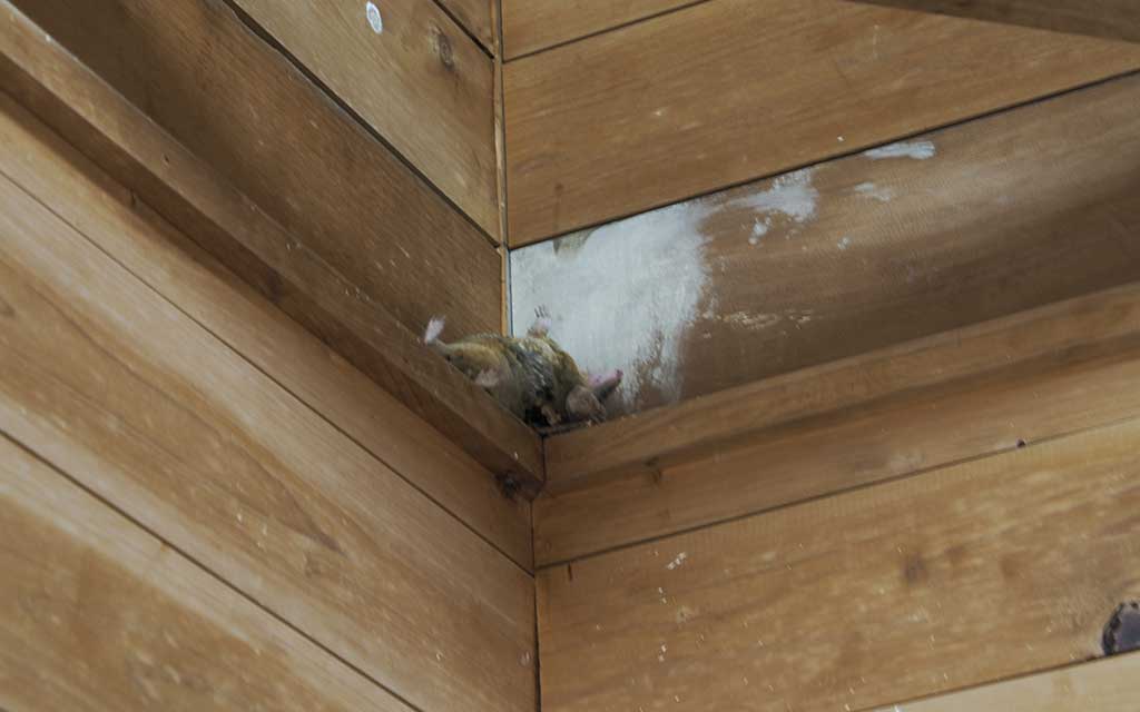 行ってみると、トイレの上部コーナーの箇所に三角の板が打ち付けられており、その上に何か置いてあります。みんなで望遠レンズで撮影したり双眼鏡で見てみますが、はっきりしたことが分かりません。下に下ろしてみようという話になりました。