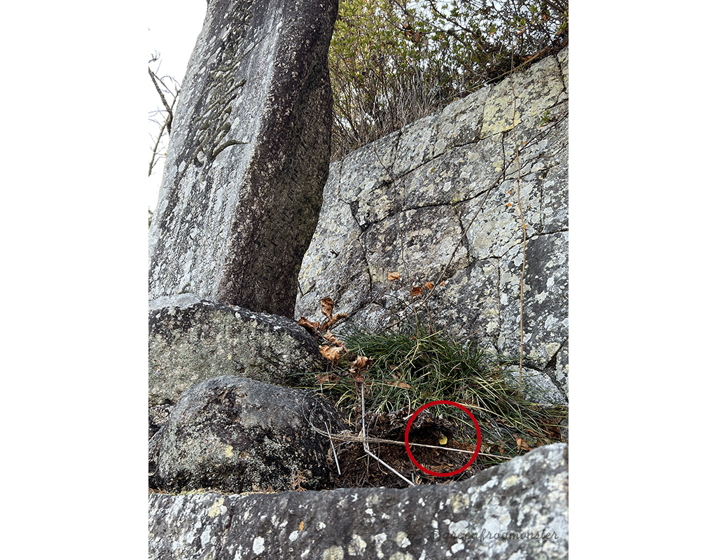 弱っているキチョウを心配しながらも帰りの階段を降りていると、右側の石碑の下に、同じ種のキタキチョウが越冬しているのを見つけました。
